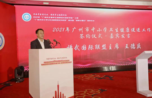 10月22日下午,禅武国际联盟总会主席王德庆先生、禅武国际联盟总会(匈牙利)广东办事处常务副主任兼行政负责人高菲女士一行出席了由广州市中小学卫生健康促进中心主办的2021年“广州市关爱学生健康成长的好学校”分享、“广州市中小学卫生健康促进专家库”建设暨“健康主题日”颁奖仪式,并与广东省健康中国研究会签署了合作框架协议。