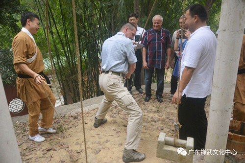 一行人先后参观了习武区、静修区和文化馆,并观看了禅武宣传片《南粤禅武韵》,一行人不仅对器材有所了解还切身体验和了解到禅武中心的魅力所在。