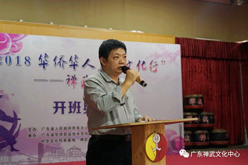 典礼在禅武纪录片《南粤禅武韵》中拉开帷幕。王奕华副处长代表广东省侨办致辞,对远道而来的学员们表示热烈欢迎,他向学员们传达了禅武研修班的办班宗旨,希望学员们珍惜宝贵的30天,努力学习禅武功夫,加深对中华文化的认识和体会,把弘扬中华文化作为己任。王奕华指出,我校禅武中心在助力广东“一带一路”建设、提升中华优秀传统文化国际影响力、探索中外文化交流互鉴新路等方面进行了积极的探索,形成了有一定国际影响力的品牌,他寄望我校今后继续打磨质量、深挖内涵、丰富形式,为中华文化传承和中外文明交流多做贡献。