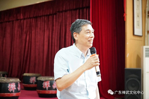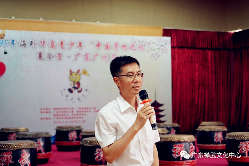 吴晓生处长代表主办方讲话。吴处长说,有这么多海外华裔青少年愿意回来参加寻根活动,他感到很欣慰,也充分肯定了广州市侨办、各区侨外办和我校禅武中心的辛勤付出。吴处长寄望营员们珍惜参营机会,学习中华文化、岭南文化,了解中国、广东的社会情况,做文化交流的使者。