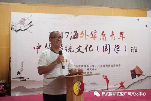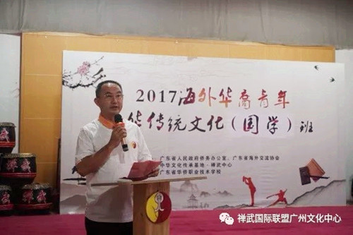 2017年11月22日,由广东省侨办、广东省海外交流协会主办的“2017海外华裔青年中华传统文化(国学)班”在禅武中心举行开班典礼。广东省侨办文教处处长吴晓生、副处长王奕华在广东省华侨职业技术学校党委副书记兼纪委书记何博欣以及中华文化传承基地•禅武中心副主任王正浪的陪同下出席了典礼。