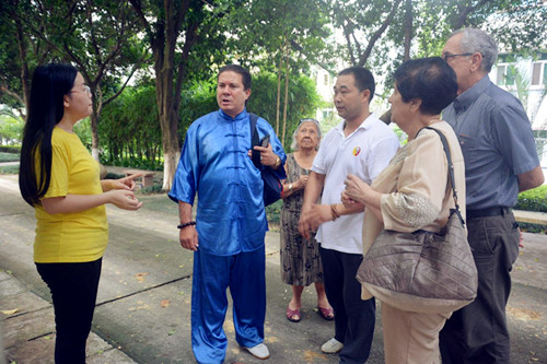 佩雷斯总领事等人在了解和学习了禅武礼仪礼节后,进入禅武中心参观和交流,他们认真倾听了史老师对禅武中心的详细介绍,尤其对禅武中心传统的练功器材深感兴趣,并高度赞扬了禅武中心对传统文化的保存和弘扬工作,李富荣先生表示,禅武中心仍保留如此传统的习武器材,实在难得。随后,在王师傅以及史老师的陪同下,领事等还参观了禅武文化馆,浓厚的人文气息和丰富多彩的校园文化氛围给领事们留下了深刻的印象。