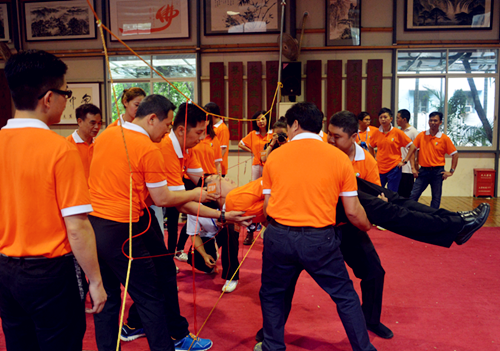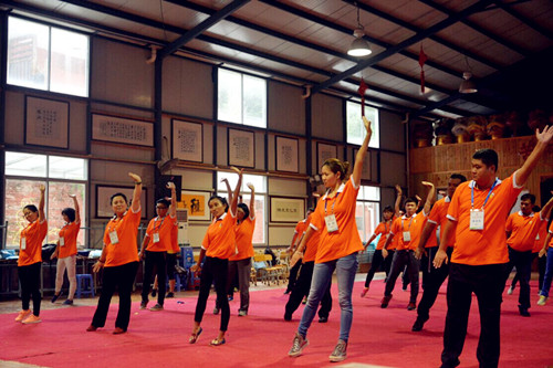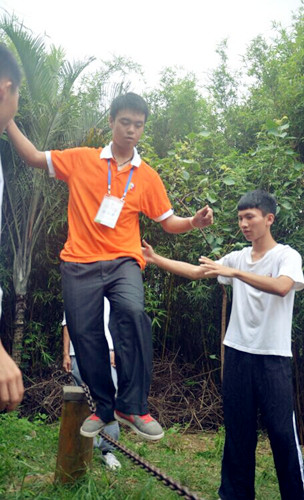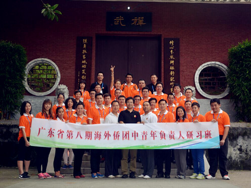 2015年5月18日上午,来自15个国家和地区的32位“广东省第八期海外侨团中青年负责人研习班”的学员们在广东省侨务办公室外联处处长林克风、外联处副处长杨圣祺、外联处主任科员马碧雯的带领下来到中华文化传承基地广东禅武中心开展为期一天的团队拓展活动。学员们互相协作,完成了“击鼓传花”、“跳大绳”、“穿越电网”、“铁索一线穿”、“击打愿望板”等多个拓展项目训练,聆听了禅武中心香学顾问、香港国学苑创始人黄健基博士关于“中华传统国学与和谐侨社建设”的讲座,并学习了由禅武中心首席教官王正浪师父教学的禅武八段锦,禅武拓展训练将修身与锻炼相结合,让青年侨领们在一动一静、一张一弛中领略中华文化的真谛,增进互相信任,构建和谐侨社。