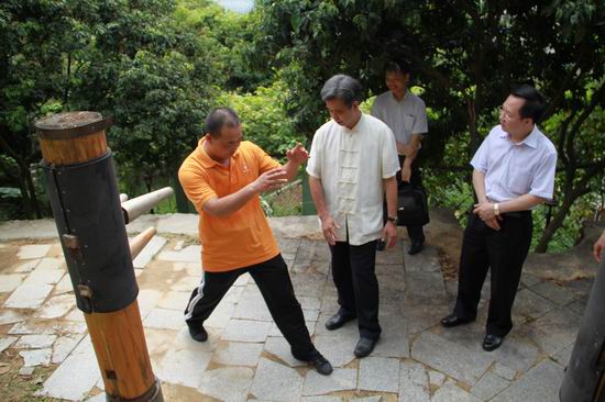 ![]() 王正浪师父向梁桂全院长(左二)、郑建民副主任(右一)介绍木人桩