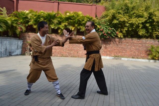 随后,考察团众人在禅武中心总教官王正浪师父的带领下,进入禅武训练场地体验禅武训练器材。王师父首先向大家阐述了禅武理念和基本内涵,并教大家施禅武礼,大家都深表敬仰和尊重。敦拿督斯里邦里玛哈芝佐哈马希鲁丁先生对禅武器材很感兴趣,纷纷尝试,意犹未尽之余,还跟王师父切磋了一番武艺。